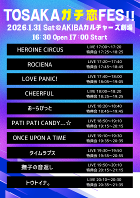 | 出演 | HEROINE CIRCUS Rociena LOVE PANIC! CHEERFUL おーらびっと PATI PATI CANDY...☆ Once Upon a Time タイムラプス 撫子の音返し トウトイナ。 |