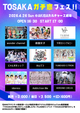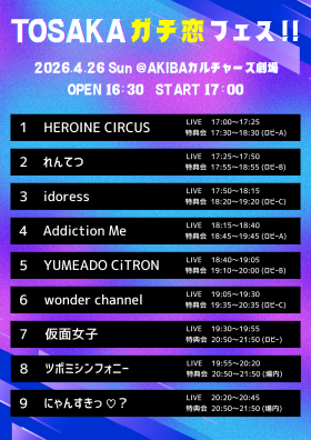 | 出演 | HEROINE CIRCUS 仮面女子 ツボミシンフォニー wonder channel Addiction Me れんてつ idoress にゃんすきっ♡? YUMEADO CiTRON |